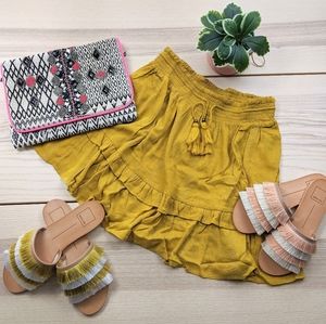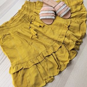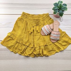 Super cute boho tiered ruffle trim skirt. I love this mustard color! 😍 Fabric is lightweight and breezy perfect for summer! Fabric/viscose