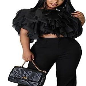 Make a statement with this eye-catching ruffle tulle blouse. Expertly designed with plus sizes in mind, this crop top features layers of luxurious tulle fabric gathered together to create beautiful ruffles. The airy fabric is a perfect addition to dressy and casual looks alike, while the timeless color makes it easy to incorporate into any wardrobe. Take your ensemble to the next level with this fashionable plus size blouse.