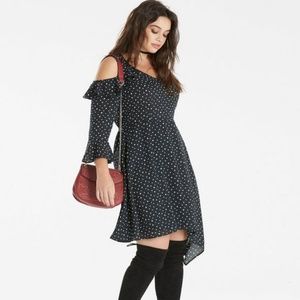 Work this season's latest trend in the ruffle front dress. The spot print dress is detailed with a fashion forward cold shoulder with an on-trend asymmetric hemline and frill detail sleeve. Take your look from day to night with over the knee boots and a crosSimply Beody bag.