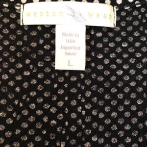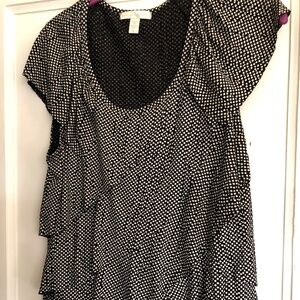 THIS RUFFLED TOP HAS RUFFLES ON THE FRONT ONLY BUT THE DESIGN ADDS DIMENSION AND THE POLKA DOT PATTERN ADDS A FUN LOOK. SCOOP NECKLINE AND STRAIGHT HEMLINE. NICE LONG LENGTH.
