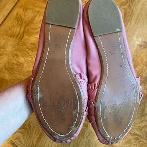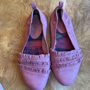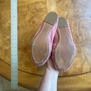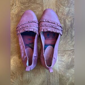 Ruffle Front Pink Loafer Flat! Ruffle front three rows and elastic top back of heel with pull tan for easy on and off. Slight scuff on bottoms otherwise like new. GUC