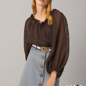 Feel effortlessly dressed up in our ruffle-neck top. It's a nod to the easy style of classic American sportswear, with voluminous sleeves and a wide, rounded neckline. Lean into this exaggerated silhouette by accessorizing with sculpted wire jewelry.