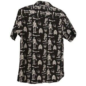 RUGBY University casual party button-up shirt for the spooky season. Black with skeletons all over. Size Large. 100 percent cotton.