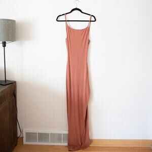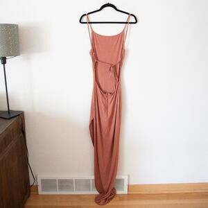 A daring side slit and a bared back add sultry drama to this sleek dress rendered in a neutral shade. 63" length (size Medium) Lined 92% viscose, 8% elastane Dry clean or hand wash, dry flat Imported