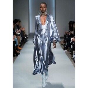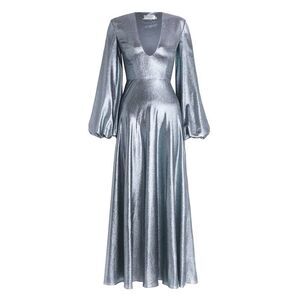 From Zimmermann Fall 16 collection, in Steel glitter lamé material. Midi length dress with plunge neckline and blouson sleeve with elasticated cuffs. Side invisible zip closure.