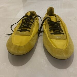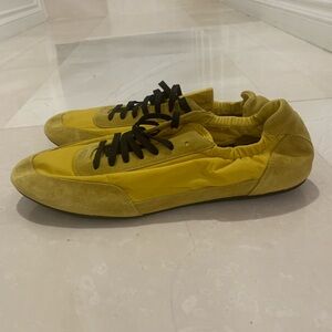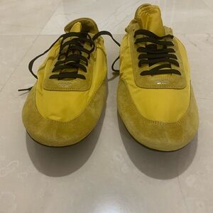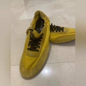 Vibrant yellow sneakers with black laces. Sleek design by Prada. Ideal for everyday wear.