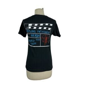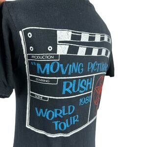 Vintage short sleeve tee from the Rush 1981 Moving Pictures concert tour. There is no care/brand tag and my mannequin is a women's size 6 for reference. Some minor wash wear and wear to the print and a slight vintage scent.