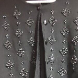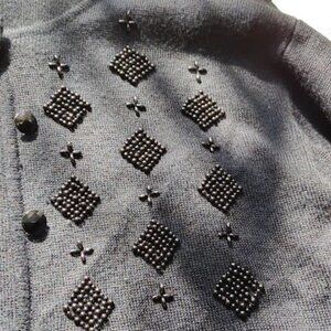 RUSS PETITES, VINTAGE, BLACK BEADED CARDIGAN, 8 BUTTON FRONT, ELEGANT, CASUAL EVENING WEAR, CLASSIC LAYER, WOMEN'S SIZE MED