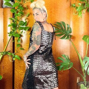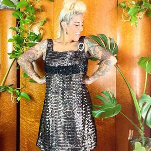 Holiday Season is quickly approaching and this GLAM beauty is ready to hit the town! Shimmy and shake in this dazzling little number by Russell of California. Banded bust in black sequins, this sparkler of a dress features a scooped neckline, glimmering rhinestone brooch, sleeveless design and a flirty, above-the-knee cut! The sides showcase black sequins and silver Lurex cording to compliment the black banded bust. Shift style, this Babe is begging for extra pointy heels, vintage earrings & 60’s ULTRA MOD hair!