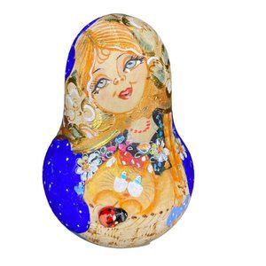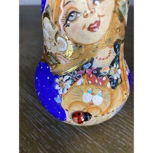 RUSSIAN ROLY POLY WOODEN DOLL NEVALYASHKA Blue Cat Bell Music Ladybug Handpainted