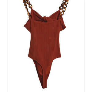 Rusty-brown one piece. Ribbed. Front tie closure. Cut-out front. Thong back. Brown, acetate chain straps. In gently used, great condition.