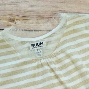 Long-sleeve, striped RUUM shirt. Very versatile! Tulle detailing at neckline. The stripes have some shimmer in the fabric. Size is 12m. Very good used condition.