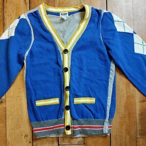Really cute RUUM size 4 boys knit cardigan sweater with argyle detail to sleeves and other colorful and classic details. 100% cotton!. Cute addition to any holiday wardrobe or outfit!