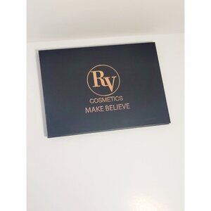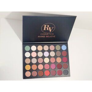RV Cosmetics Makeup Palette with 35 Colors The "Make Believe" makeup palette by RV Cosmetics offers an impressive collection of 35 eyeshadows in a variety of colors. This palette includes neutral, warm, cool, and vibrant tones, allowing you to create a wide range of looks, from natural to dramatic. The packaging is elegant and sophisticated, featuring a black case with the RV Cosmetics logo and the collection name "Make Believe" in gold lettering.
