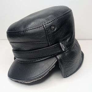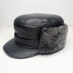 Pre-owned. Black leather faux fur lined trapper hat by R&V. Excellent condition. Clean with no wear. Snap fold down neck cover. Size XXL. cap measures approximately 23".