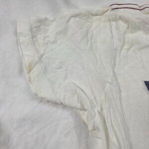 Faded graphic print and discoloration throughout, including stains on the front and back of the shirt