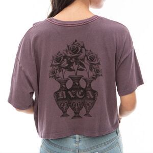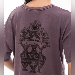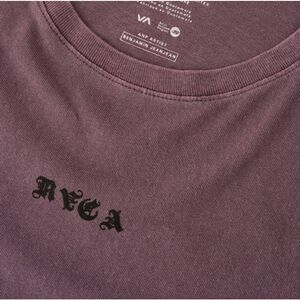 The t-shirt features the RVCA logo in black lettering across the chest. This t-shirt is part of the Benjamin Jeanjean collection for RVCA. Benjamin Jeanjean is an artist, surfer, photographer, and designer known for his surreal and tattoo-inspired graphics. The t-shirt in the image is specifically the "Benjamin Jeanjean Bouquet T-Shirt" in a "Pale Mauve" or "New Plum" color. It is a slim-fit, pigment-dyed tee made from lightweight cotton, featuring custom artwork by Jeanjean. RVCA, pronounced "roo-cah," is a clothing company based in Costa Mesa, California, and the name means "clothes" in Greek.