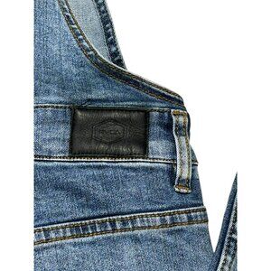 Stylish denim jumpsuit by RVCA. Features adjustable straps and front pocket. Perfect for casual wear.