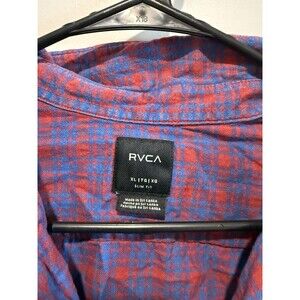 The RVCA Blue and Red Button Down Men's Slim Fit Shirt in XL size features a stylish plaid pattern in blue color with a collared neckline and long sleeves. This versatile shirt is suitable for various occasions including travel, parties, casual outings, and formal events. The slim fit design and button-up closure add a modern and polished touch, making it a great addition to any man's wardrobe. The RVCA brand is known for its bohemian, outdoor, and classic themes, making this shirt a fashionable choice for the winter, fall, and spring seasons.41