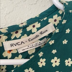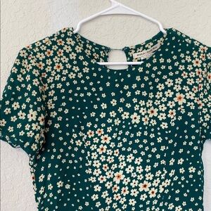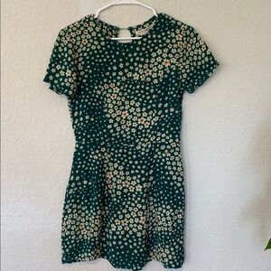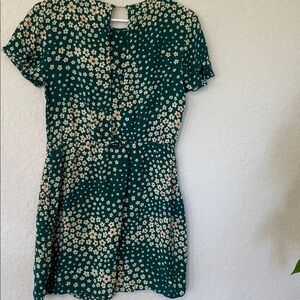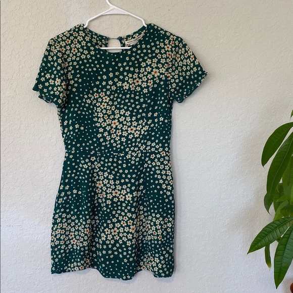 Stylish green dress with floral design. Short sleeves and elegant fit. Opening on the back