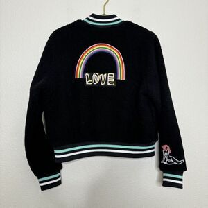 RVCA Jacket Sz 8 Small Love Rainbow Black Dream Team Letterman Patch Sherpa $160