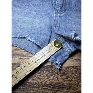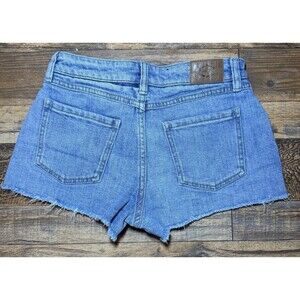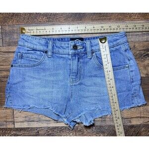 These RVCA Cupid denim cutoff shorts in size 25 feature a light blue wash, frayed hem, and raw edge detailing for a casual, worn-in look. They have a classic five-pocket style, zip fly with button closure, and a comfortable mid-rise fit. In like new conditionplease refer to photos for measurements and details.