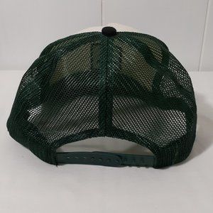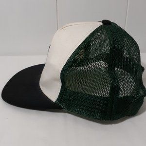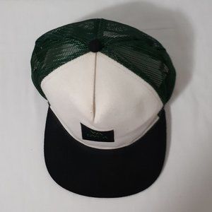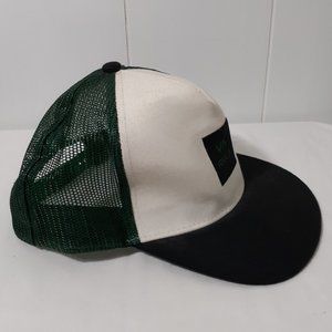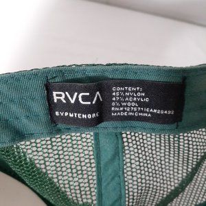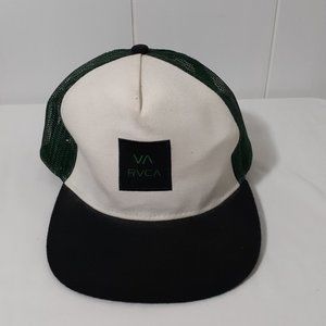 RVCA Trucker style hat. Front embroidered black box logo reads: VA RVCA in green embroidering. Top front of the hat is white. Has a black bill. Green mesh back. Snapback closure. Barely used, sat in closet.