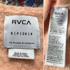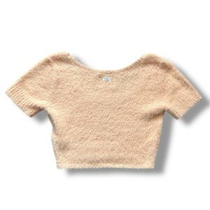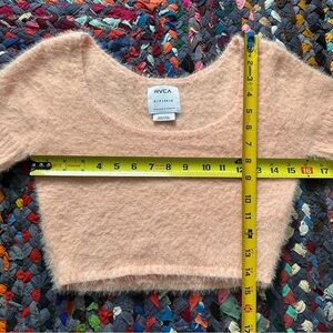 RVCA Murray Sweater in Coral (light pink with a hint of orange). Fuzzy soft knit. Short sleeves, scoop neck, cropped length. Nylon/acrylic blend. Preowned in very good condition, no holes or stains.