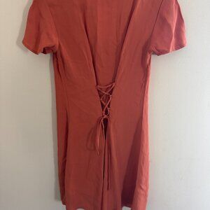 Chic and playful RVCA dress in a soft salmon/pink shade. Features a flattering v-neckline, button-up front, and a criss-cross tie back detail for an adjustable fit. Short, above-the-knee length makes it perfect for casual days or dressed-up nights.