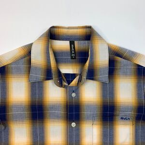 RVCA Shirt Mens S Small Yellow Blue Plaid Button Up Short Sleeve Drop Cut Pocket