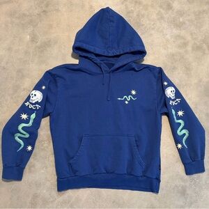 RVCA hoodie sweatshirt in color moody blue. Sleeves feature serpent, skull and star designs. Great used condition.