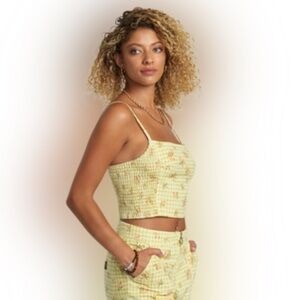Chic yellow camisole with floral pattern. Ideal for casual wear. Lightweight and stylish.