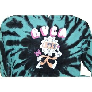 RVCA Women Large Hoodie Blue Black Tie Dye Fleece Pullover Sweatshirt Cat Graphi