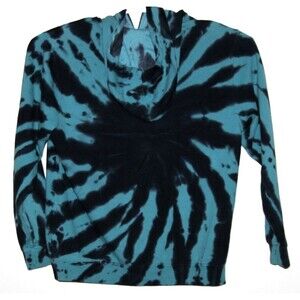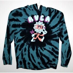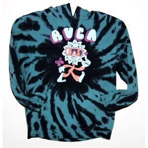 The RVCA Hoodie for women in size Large is a stylish blue and black tie-dye fleece pullover sweatshirt with a unique black cat design. Perfect for activewear, this hoodie combines comfort and style for a trendy look.