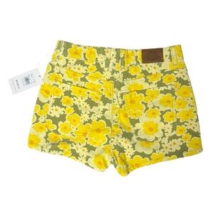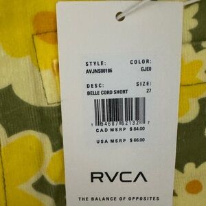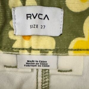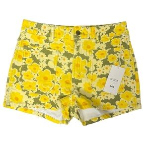 Embrace a vibrant look with these RVCA high-waisted shorts, showcasing a lively yellow and green color floral palette. Designed for a flattering fit, these shorts offer a cheerful aesthetic perfect for sunny days. The structured fabric ensures a comfortable and stylish wear. Soft corduroy. Zipper and button closure.