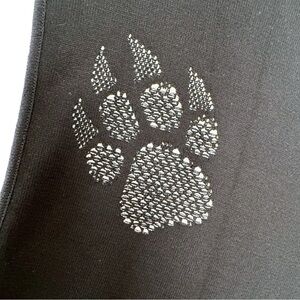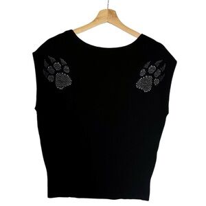 This Knit Sweater Short Sleeve Top from RVN is constructed in double layers of 50% rayon, 32% Viscose, 18% nylon black and light tan stretch knit fabric. It features a high round neckline, short cap sleeves, a pull over style and cut out illusion frenchy bulldog novelty front print. This is novelty, layering, neutral, frenchy dog mom vibe.