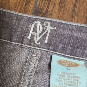 This is a pair of grey jeans by RVT. They have some embroidery on the back pockets, and the fly button is stamped with the brand.