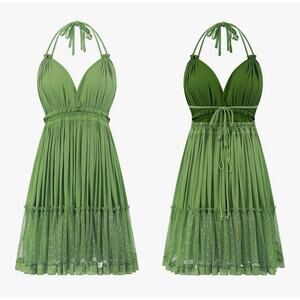 Effortlessly feminine and free-spirited, this R.Vivimos Boho Patchwork Swing Mini Dress in green combines lace, ruffle, and polka dot details for a dreamy look. Features a deep V-neck, open back, and adjustable ties at the top and waist for a flattering, customizable fit.
