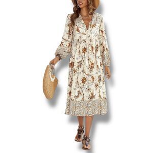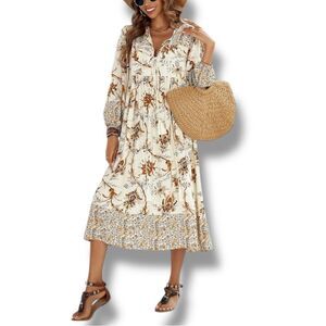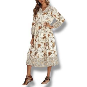 R.Vivimos Women's Long Sleeve Floral Print Retro V Neck Tassel Bohemian Midi Dress in the Size Large in Cream/Brown Combo