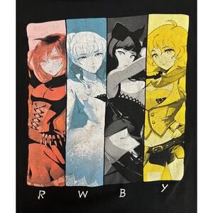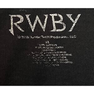 Description: This is a RWBY T-shirt featuring vibrant prints of the main characters Ruby, Weiss, Blake, and Yang. The shirt is made of 100% cotton for comfortable wear and displays striking colors with the iconic RWBY branding. The tag confirms it is officially licensed merchandise by Rooster Teeth Productions.