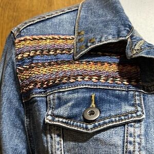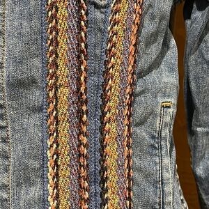 This jacket is so cute!! It has a hummingbird patch, a flower patch, decorative ribbon and studs on the front of the jacket. Two slit pockets and two chest pockets. Smoke free home.