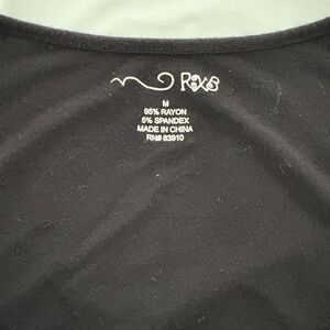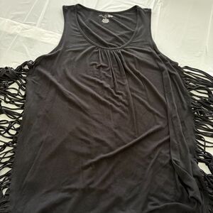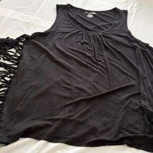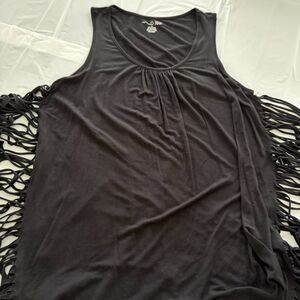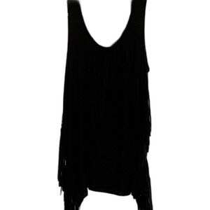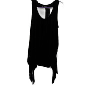 RXB Fringed Tank Top. Size Medium. Black. Rayon 95%, Spandex 5%. Unfinished bottom hem. Round neck. Approx. measurements: pit to pit 19", shoulder to bottom unfinished hem 26". Excellent preowned condition. No flaws, rips, stains.