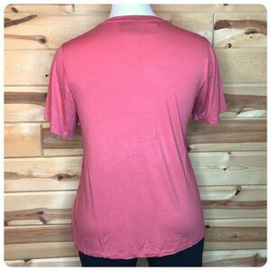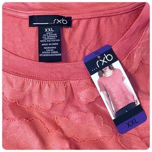 RXB round neck short sleeve top with sheer floral overlay on the front which is also lined so you can't see through the sheer part. Color is spiced coral and size is XXL. This top is new with tags.