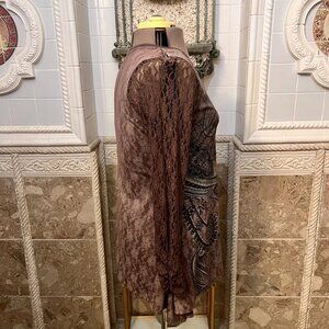 RXB. Sz XL. Asymmetrical. Brown Paisley Embellished Tunic Pullover. Lace Sleeves 26" with vertical elastic at wrist. Bust 20.5/41". Poly rayon.