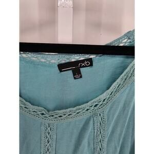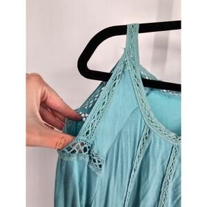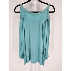 RXB Womens Sz L Long Sleeve Cold Shoulder Blouse Light Blue Crochet Boho