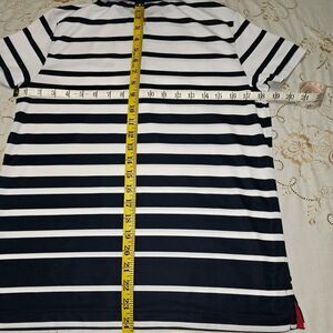 The product is a Ladies Ralph Lauren Polo Golf striped shirt size medium, part of the Ryder Cup 2016 collection from Hazeltine. It features a collared neckline, short sleeves, and a button closure with the iconic Polo Pony embroidered detail. The shirt is in a medium size with a tailored fit, making it a great addition to any woman's wardrobe for a classic, sporty look. Made with lightweight, breathable fabric, this shirt is machine washable and wrinkle-resistant, perfect for the golf course or casual wear.
