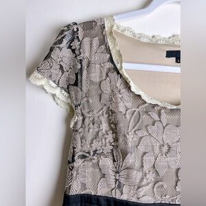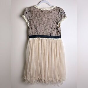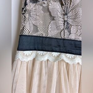 Lace and tulle skirt dress. Bodice has black floral lace over cream lining. Black satin ribbon at waistband. Cream tulle skirt. Ivory lace trim at neck, cap sleeves and waist. Side zipper.