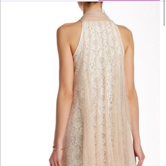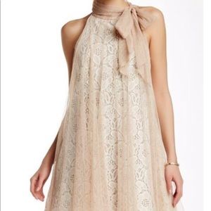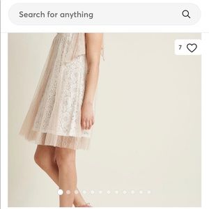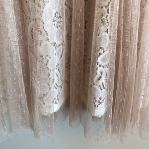 Adorable dress by RYU. Very romantic. Swiss dot Beige mesh overlay to off white lace. Lined. Mock self tie at neck. 30 1/2” from top front to bottom of mesh overlay. 28 1/2” from top front to lace underneath. Worn ONCE for an engagement celebration.