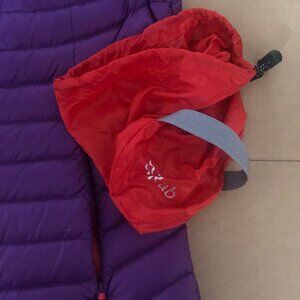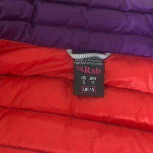 Rab Puffy Vest. Purple and a reddish orange. Lightweight, worn once. Perfect, like new condition.