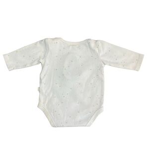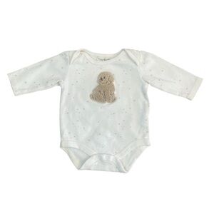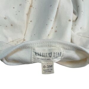 Adorable 2-piece baby outfit from Rabbit and Bear in size 0-3 months. This lightly worn set includes a cream long sleeve bodysuit featuring an embroidered teddy dog applique and matching footed pants with a delicate star pattern. Made from soft, breathable cotton for all-day comfort. Perfect for both boys and girls, this neutral set makes a great baby shower gift or everyday outfit. Gently used and in excellent condition.